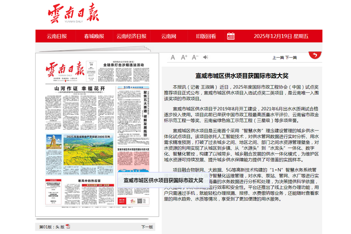 - 《云南日報》頭版:宣威市城區(qū)供水項(xiàng)目獲國際市政大獎